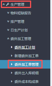 点晴ERP-委外加工单管理流程 进入ERP系统之后,在左侧的功能菜单里找到“生产管理”,点开“委外加工管理”,点击“委外加工单管理”。 2.进入页面后,按图操作:选好委外单类型、物料类型以及单据状态,然后点击查询。在下方得到当前确认的加工单信息。