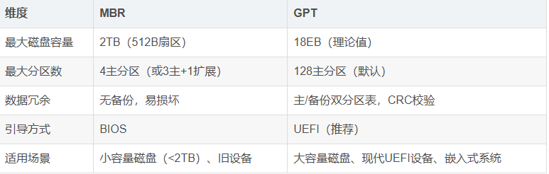 GPT(GUIDPartitionTable,全局唯一标识分区表)和MBR(MasterBootRecord,主引导记录)是两种主流的磁盘分区方案。 以下简要对比两者的区别: 1.核心数据结构与存储方式MBR(传统方案)存储位置:仅占用磁盘的第一个扇区(512字节),称为“主引导记录”。结构组成:前446字节:引导...