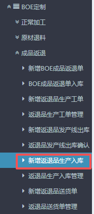 点晴ERP-BOE返退_返退品生产入库流程 1.进入ERP系统之后,在左侧的功能菜单里找到“BOE定制”,点开“成品返退”,点击“新增返退品生产入库”。 2.进入界面后,按图操作:点击选择入库仓库,备注可根据情况补充。 3.接下来下方点击“货品编码”,会弹出物料信息窗口。 在弹窗的物料信息窗口内,选择订...