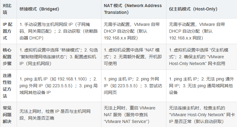 前言:VMware三种核心网络模式分别是桥接模式、NAT模式、仅主机模式,核心差异在于虚拟机与主机、外部网络的连通性。 1.桥接模式(Bridged)虚拟机通过虚拟网桥直接连接到物理网络;虚拟机与主机在同一网段,相当于独立电脑;若需上网,网关和DNS与主机保持一致。2.NAT模式(NetworkAddressTran...