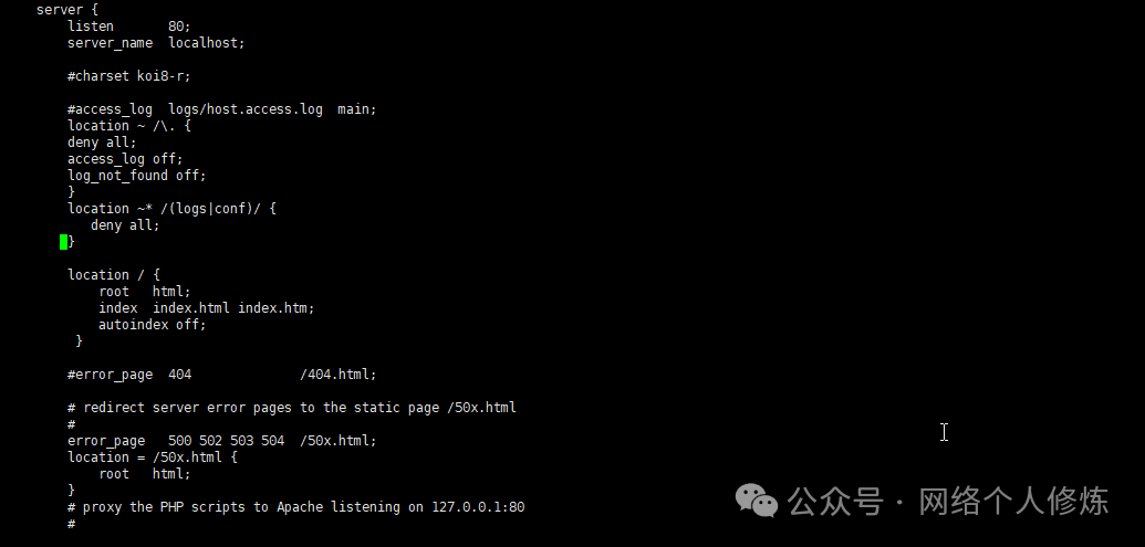 #禁止访问隐藏文件设置(如.git、.env、.htaccess等隐藏文件)location ~ /\. {deny all; # 拒绝所有访问请求access_log off# 不记录此类访问日志(减少日志冗余)log_not_found off# 不记录"文件未找到"的错误日志}#禁止访问特定目录设置(此处示例为logs和conf目录)location ~* /(logs|conf)/ {deny all; # 拒绝所有访问请求#可根据实际需求添加其他敏感目录,格式:在括号内用|分隔,如/(logs|conf|data|backup)/}