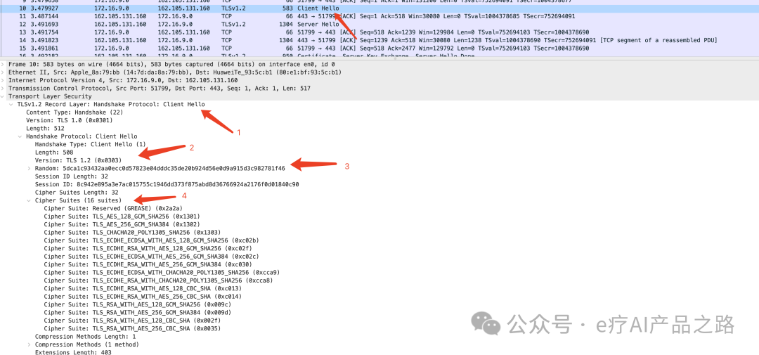 2. 客户端支持的TLS版本为TLS 1.2 (0x0303), 其中0x0303为内部版本号,如TLS1.3为0x0304
