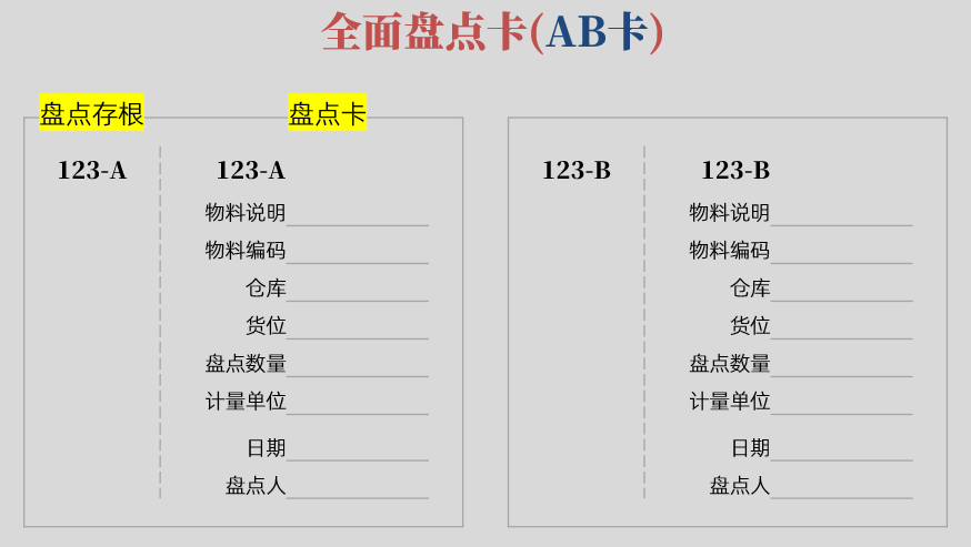 上面是盘点卡的样张。因为同种物料要盘点两次,所以在设计盘点卡的时候,可以设计A卡和B卡两张盘点卡, A卡给A组用,B卡给B组用。A卡和B卡上面的核心内容是一样的。每张卡都附有盘点存根。就像我们的电影票或者飞机票,在入场的时候,要把存根撕下来给影院或者飞机上的工作人员。