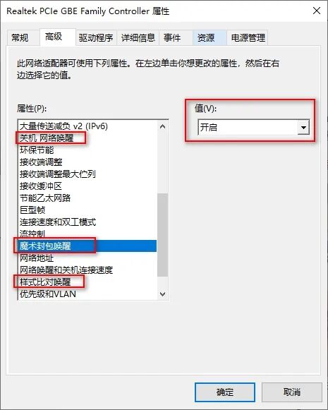 右键网卡选择「属性」,切换到「高级」选项卡,找到以下选项并设置为「启用」: