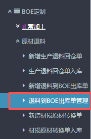 1. 进入ERP系统之后,在左侧功能菜单里找到“BOE定制”,点开“原材退料”,找到“新增退料到BOE出库单