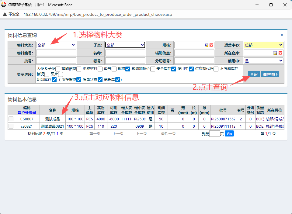 在弹出的物料信息窗口内,按图操作:点击选择物料大类,点击查询。然后点击对应物料信息