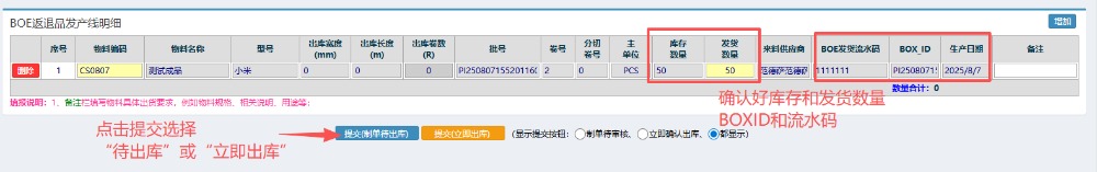 4.选好物料之后,检查确认库存发货数量,以及BOXID和流水码。点击提交选择“待出库”或“立即出库