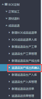 1.进入ERP系统之后,在左侧的功能菜单里找到“BOE定制”,点开“成品返退”,点击“新增返退品发产线出库”。