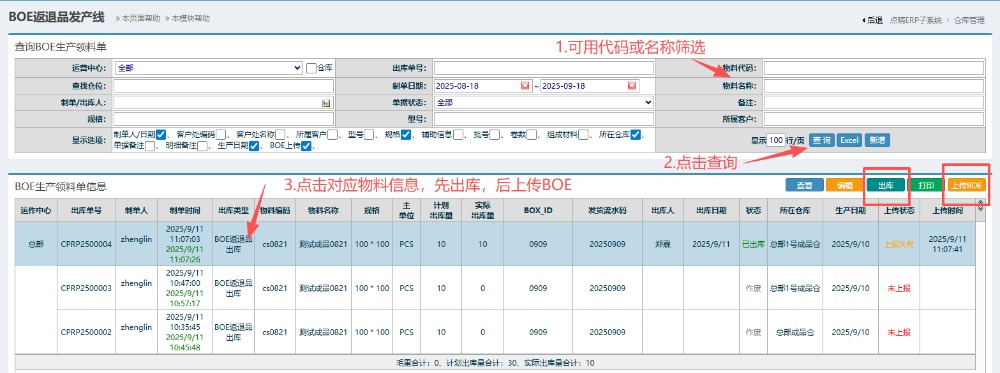 6.进入界面后,按图操作:可用代码或名称筛选查找,点击查询。然后点击对应物料信息,先进行出库,再上传BOE