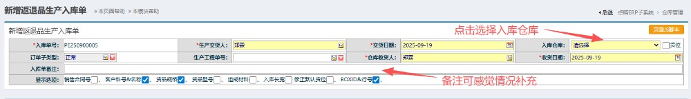 2.进入界面后,按图操作:点击选择入库仓库备注可根据情况补充。
