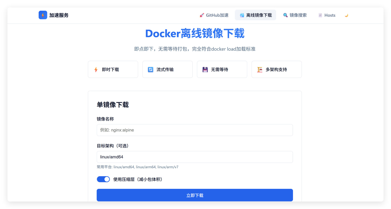 • 🐳 离线镜像包 - 支持下载离线镜像包,流式传输加防抖设计。