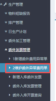 1. 进入ERP系统之后,在左侧的功能菜单里找到“生产管理”,点开“委外发票管理”,点击“新增委外费用异常单”。