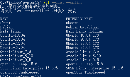 wsl --install:安装WSL和Linux的默认Ubuntu分发版,还可以使用此命令通过运行wsl --install <Distribution Name>来安装其他 Linux 分发版(如果在 Windows 10 或更早版本上运行 WSL,则可能需要将-d标志包含在命令中--install以指定分发版: wsl --install -d <distribution name>)。