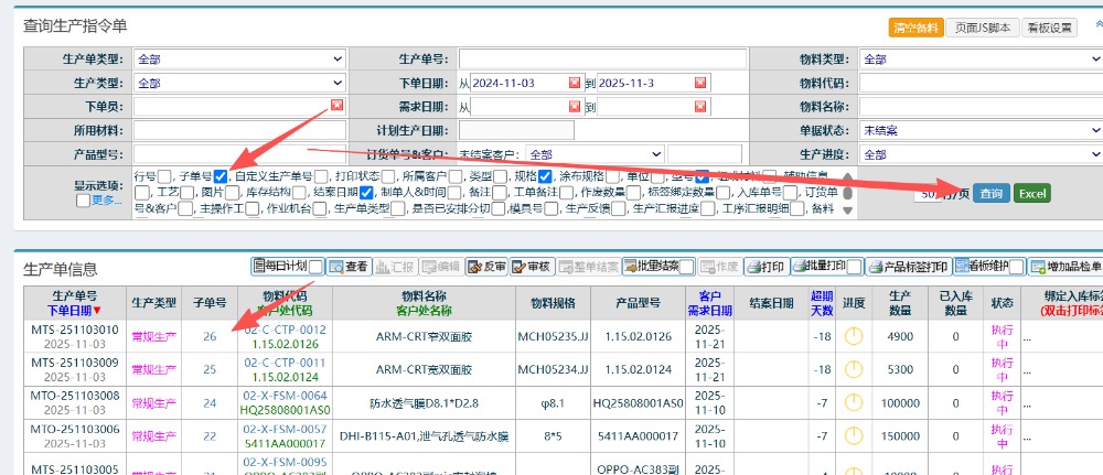 后续如果还有出现类似子单号的情况的话可以在生产工单的页面取消勾选“子单号”进行查询。